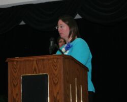 Michelle Rawlins, Science Instructor, reading message from Jim Rittler, current Ag & Industrial Power Instructor:
